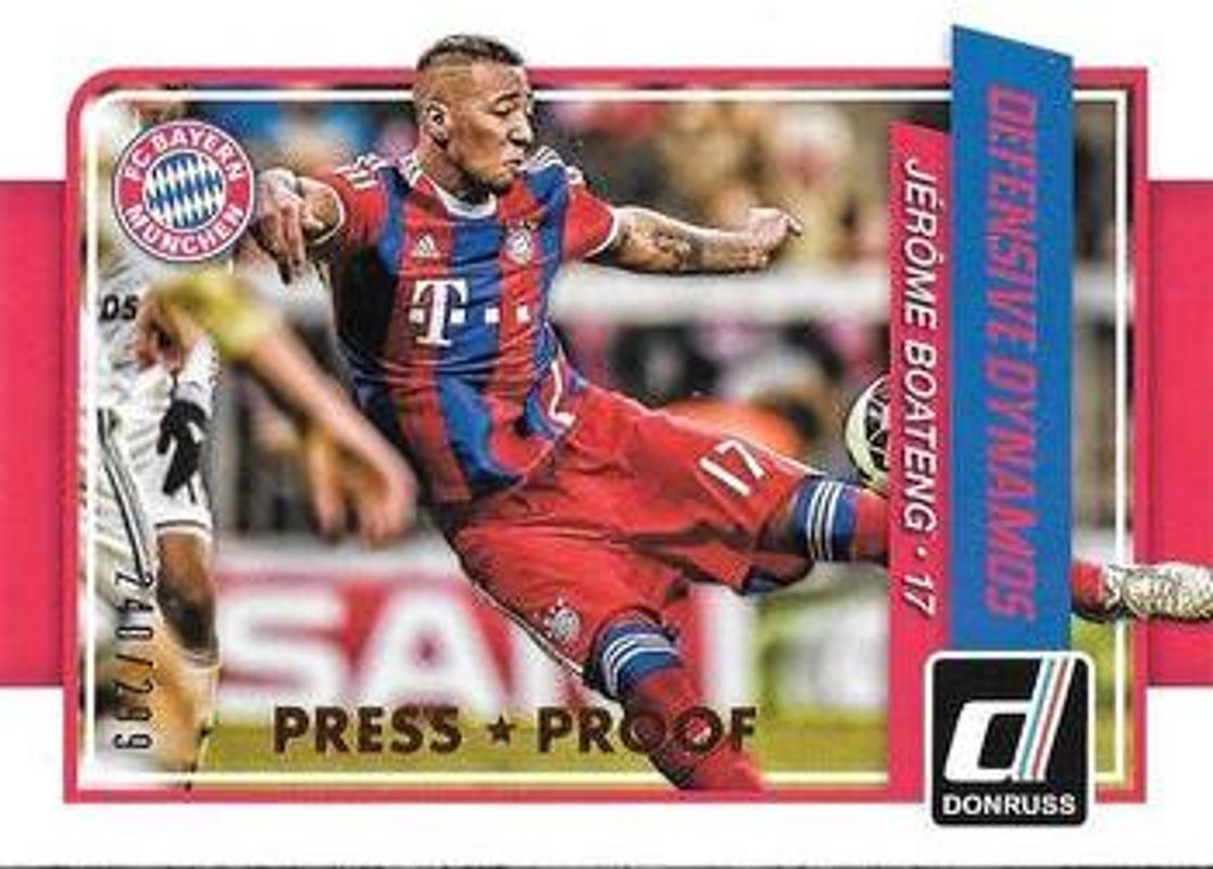 The Jerome Boateng 2015 Donruss #3 Defensive Dynamos Bronze Press Proof /299 card is 1 of 8 Jerome Boateng's card variations in the 2015 Donruss set being tracked by Sports Card Investor, including Defensive Dynamos, Defensive Dynamos Silver Press Proof /199, Defensive Dynamos Gold Press Proof /99, Defensive Dynamos Red Soccer Ball /49, and Defensive Dynamos Green Soccer Ball /25.