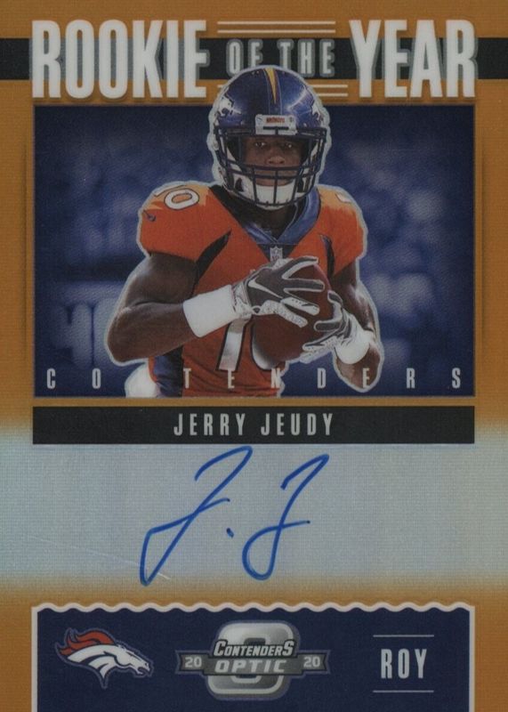 The Jerry Jeudy 2020 Contenders Optic #ROY10 Rookie of the Year Contenders Autographs - Orange /50 card in Raw condition has not changed in price in the last 30 days and was last sold for $17.50 .