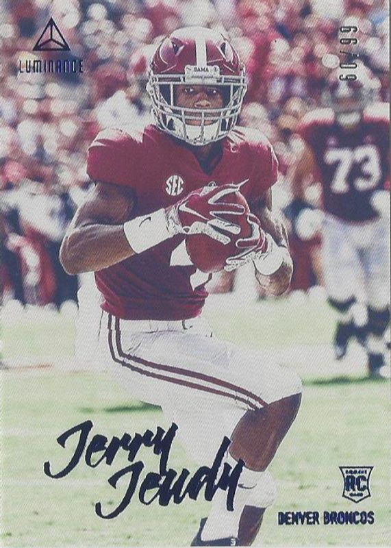 This card is 1 of 9 Jerry Jeudy's card variations in the 2020 Luminance set being tracked by Sports Card Investor, including Base, Gold (Rookie) /250, Green /75, Orange /50, and Red /25.
