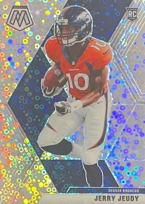 This card is 1 of 77 Jerry Jeudy's card variations in the 2020 Mosaic set being tracked by Sports Card Investor, including Base, NFL Debut, Choice Red & Green, Green, and NFL Debut - Choice Red & Green.