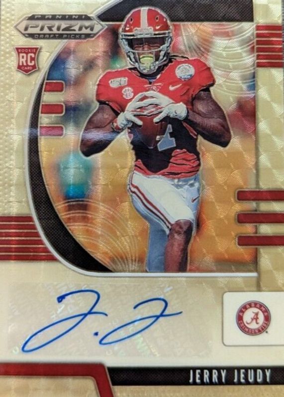 The Jerry Jeudy 2020 Prizm Draft Picks #103 Autographs - Gold Vinyl /5 Rookie card in Raw condition has not changed in price in the last 30 days and was last sold for $69.00 .