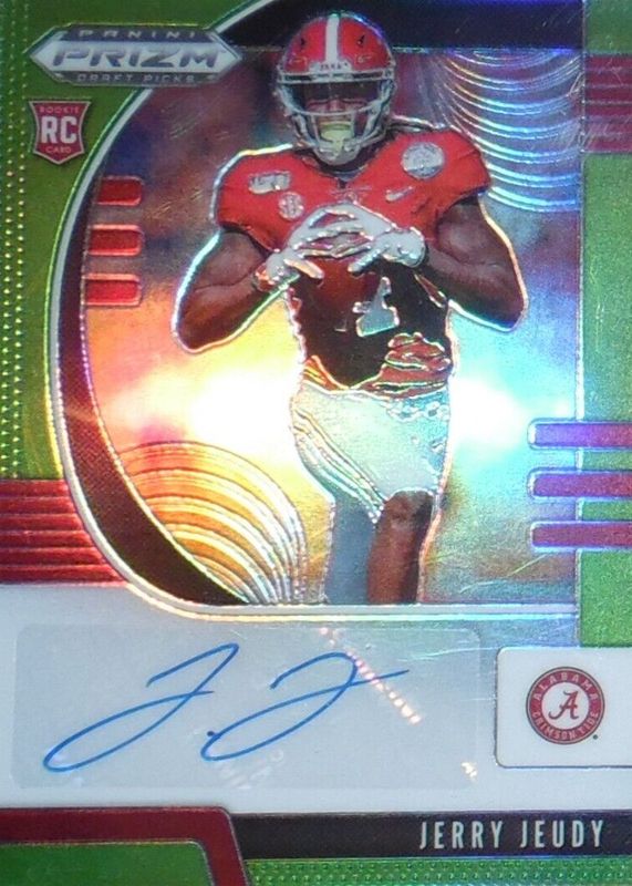 The Jerry Jeudy 2020 Prizm Draft Picks #103 Autographs - Neon Green (/25) Rookie card in Raw condition has not changed in price in the last 30 days and was last sold for $30.00 .