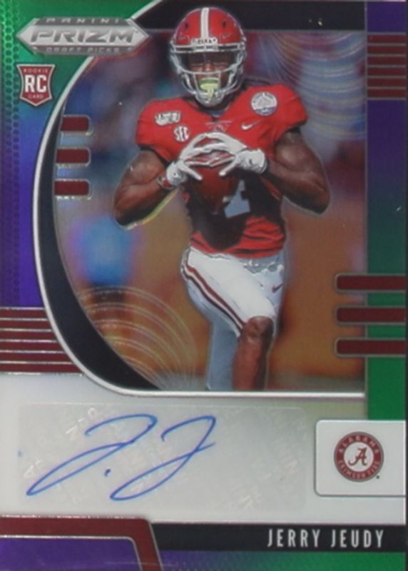 The Jerry Jeudy 2020 Prizm Draft Picks #103 Autographs - Purple & Green (/125) Rookie card in Raw condition has not changed in price in the last 30 days and was last sold for $7.50 .