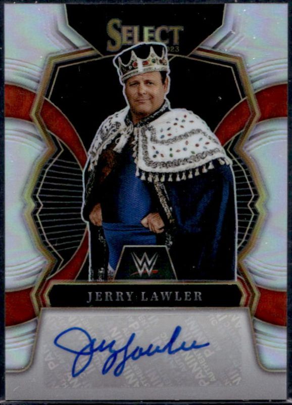 The Jerry Lawler 2023 Select WWE #SG-JLW Signatures card is 1 of 34 Jerry Lawler's card variations in the 2023 Select WWE set being tracked by Sports Card Investor, including Base, Orange Flash, Red & Blue, Red Wave, and Silver.