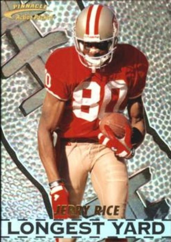 The Jerry Rice 1996 Action Packed Flagship #6 Longest Yard card is 1 of 10 Jerry Rice's card variations in the 1996 Action Packed Flagship set being tracked by Sports Card Investor, including Base, Artist's Proofs, 24kt Gold, Ball Hog, and Promos.