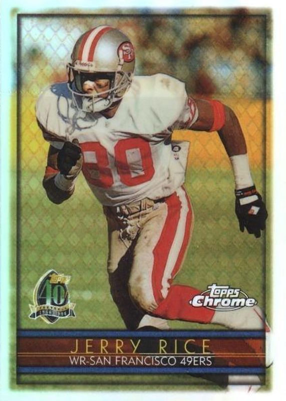 This card is 1 of 9 Jerry Rice's card variations in the 1996 Topps Chrome set being tracked by Sports Card Investor, including #98 Base, #91 Base, #91 1,000 Yard Club - Refractor, #91 Refractor, and #28 40th Anniversary Retros.