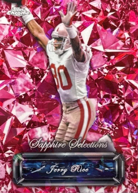 The Jerry Rice 2024 Topps Chrome Sapphire Edition #SS-14 Sapphire Selections - Padparadscha /1 card in Raw condition has not changed in price in the last 30 days and was last sold for $350.00 .