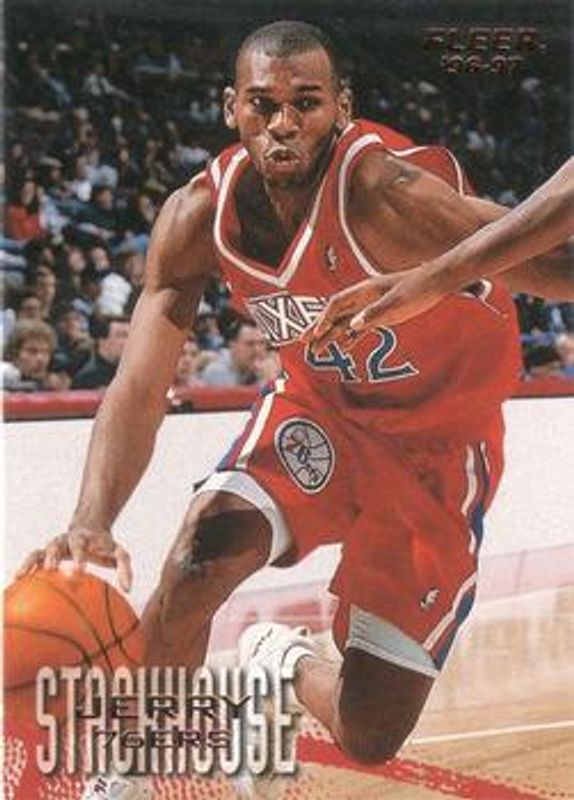 The Jerry Stackhouse 1996 Fleer European #83 Base card is 1 of 5 Jerry Stackhouse's card variations in the 1996 Fleer European set being tracked by Sports Card Investor, including #139 Base, #307 Base, #9 Rookie Rewind, and #15 Swing Shift.
