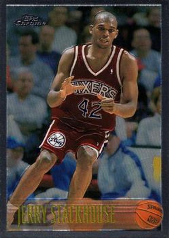 The Jerry Stackhouse 1996 Topps Chrome #42 Base card is 1 of 5 Jerry Stackhouse's card variations in the 1996 Topps Chrome set being tracked by Sports Card Investor, including #42 Refractor, #42R Refractor, #PF-16 Pro Files, and #YQ10 Youthquake.