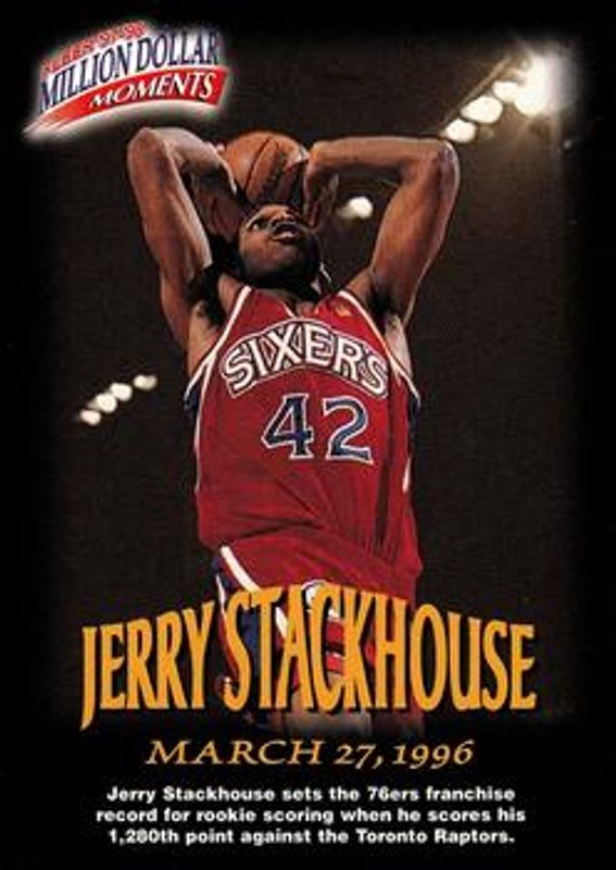 The Jerry Stackhouse 1997 Fleer #27 Million Dollar Moments card is 1 of 12 Jerry Stackhouse's card variations in the 1997 Fleer set being tracked by Sports Card Investor, including #42 Base, #255 Base, #255 Crystal, #42 Crystal, and #42 Tiffany.