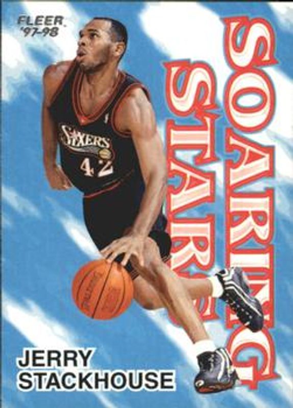 The Jerry Stackhouse 1997 Fleer #18SS Soaring Stars card is 1 of 12 Jerry Stackhouse's card variations in the 1997 Fleer set being tracked by Sports Card Investor, including #42 Base, #255 Base, #255 Crystal, #42 Crystal, and #42 Tiffany.