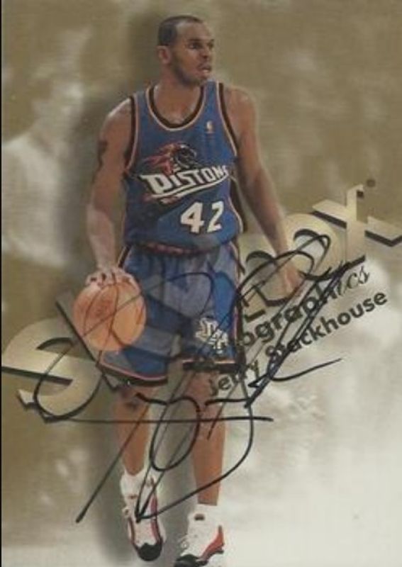 The Jerry Stackhouse 1998 Skybox Premium Autographics card is 1 of 4 Jerry Stackhouse's card variations in the 1998 Skybox Premium set being tracked by Sports Card Investor, including Base, Star Rubies /50, and Autographics Blue /50.