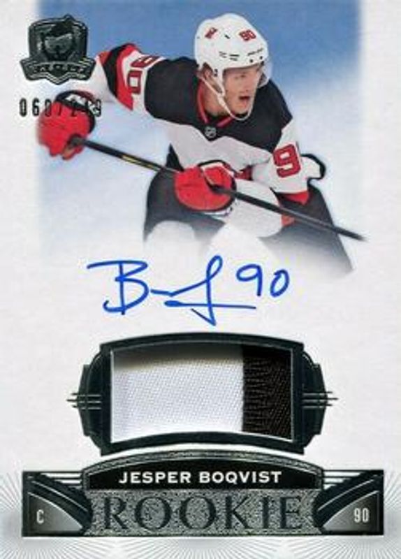 The Jesper Boqvist 2019 Upper Deck The Cup #103 Base /249 Rookie card is 1 of 115 Jesper Boqvist's card variations in the 2019 Upper Deck The Cup set being tracked by Sports Card Investor, including Signatures Materials /99, Signatures Materials Rookies /99, Exquisite Collection Endorsements Relics /50, Foundations Rookies Jersey /49, and Exquisite Collection Rookie Auto Patch /27.