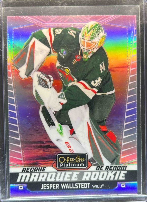 The Jesper Wallstedt 2024 O-Pee-Chee Platinum #204 Sunset Rookie card is 1 of 39 Jesper Wallstedt's card variations in the 2024 O-Pee-Chee Platinum set being tracked by Sports Card Investor, including Base, Neon Yellow Surge, Pink Magma, Rainbow, and Violet Pixels /299.
