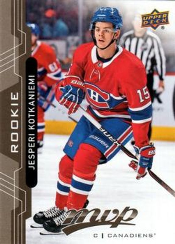 The Jesperi Kotkaniemi 2018 Upper Deck MVP #253 Base Rookie card is 1 of 2 Jesperi Kotkaniemi's card variations in the 2018 Upper Deck MVP set being tracked by Sports Card Investor, including Pack Wars Rookie Auto Parallel.