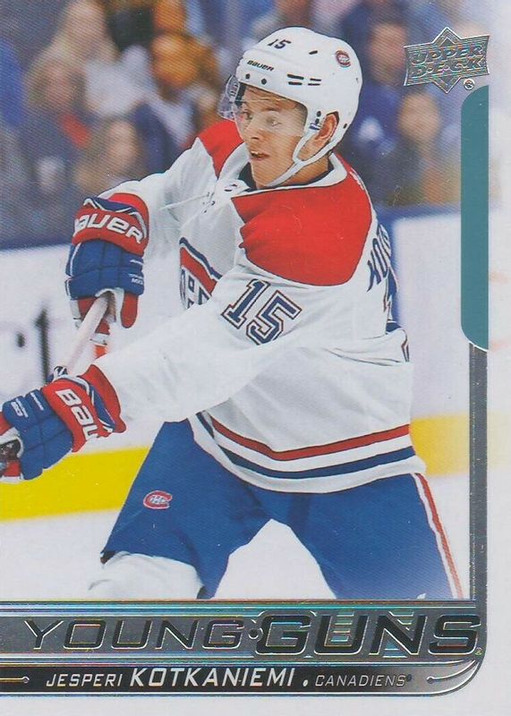 The Jesperi Kotkaniemi 2018 Upper Deck #249 Young Guns Base Rookie card in Raw condition has moved up $1.85 (+74.0%) in the last 30 days and was last sold for $4.35 .