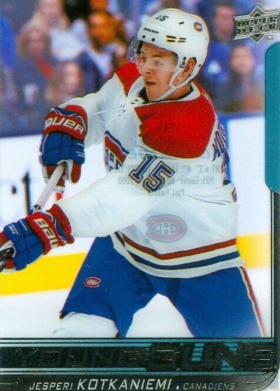 This card is 1 of 8 Jesperi Kotkaniemi's card variations in the 2018 Upper Deck set being tracked by Sports Card Investor, including Young Guns Base, Young Guns Canvas, Young Guns - Jumbo, Young Guns - Silver Foil, and Young Guns - Speckled Rainbow Foil.