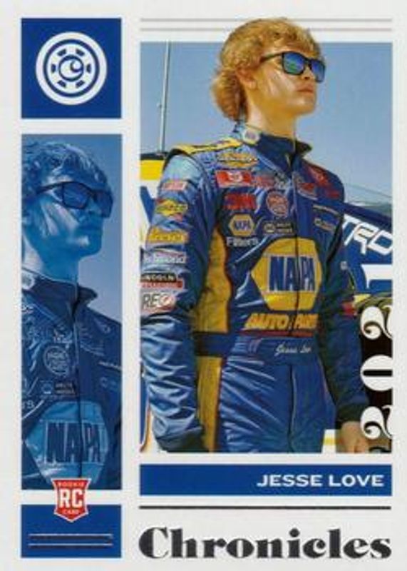 The Jesse Love 2021 Chronicles NASCAR #11 Base card is 1 of 52 Jesse Love's card variations in the 2021 Chronicles NASCAR set being tracked by Sports Card Investor, including Blue /199, Red /99, Purple /25, Gold /10, and Black /1.