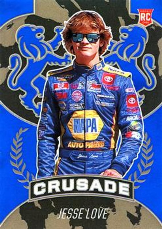 The Jesse Love 2021 Chronicles NASCAR #6 Crusade - Blue /199 card is 1 of 52 Jesse Love's card variations in the 2021 Chronicles NASCAR set being tracked by Sports Card Investor, including Base, Blue /199, Red /99, Purple /25, and Gold /10.