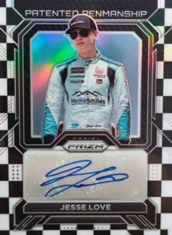 The Jesse Love 2023 Prizm NASCAR #PP-JLO Patented Penmanship - Checkered Flag /50 card is 1 of 20 Jesse Love's card variations in the 2023 Prizm NASCAR set being tracked by Sports Card Investor, including Autographs, Patented Penmanship, Patented Penmanship Hyper Red White & - Blue, Patented Penmanship Reactive - Blue, and Patented Penmanship - Purple Velocity /99.