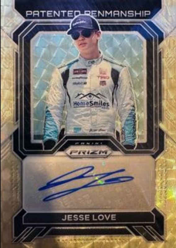 The Jesse Love 2023 Prizm NASCAR #PP-JLO Patented Penmanship - Gold Vinyl /1 card is 1 of 20 Jesse Love's card variations in the 2023 Prizm NASCAR set being tracked by Sports Card Investor, including Autographs, Patented Penmanship, Patented Penmanship Hyper Red White & - Blue, Patented Penmanship Reactive - Blue, and Patented Penmanship - Purple Velocity /99.