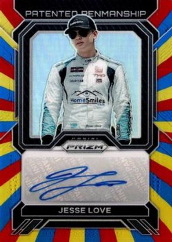 The Jesse Love 2023 Prizm NASCAR #PP-JLO Patented Penmanship - Rainbow /24 card is 1 of 20 Jesse Love's card variations in the 2023 Prizm NASCAR set being tracked by Sports Card Investor, including Autographs, Patented Penmanship, Patented Penmanship Hyper Red White & - Blue, Patented Penmanship Reactive - Blue, and Patented Penmanship - Purple Velocity /99.