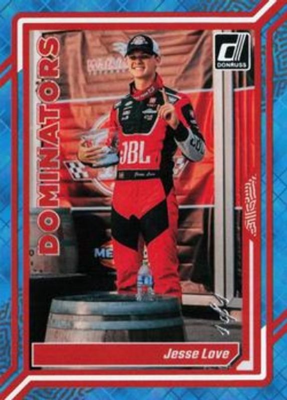 The Jesse Love 2024 Donruss NASCAR #20 Dominators Platinum Diamond /1 card is 1 of 102 Jesse Love's card variations in the 2024 Donruss NASCAR set being tracked by Sports Card Investor, including #156 Base, #188 Base, #56 Base, #156 Optic, and #56 Optic.