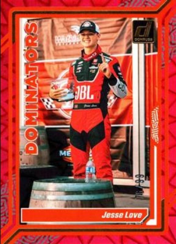 The Jesse Love 2024 Donruss NASCAR #20 Dominators Red Xplosion /99 card is 1 of 102 Jesse Love's card variations in the 2024 Donruss NASCAR set being tracked by Sports Card Investor, including #156 Base, #188 Base, #56 Base, #156 Optic, and #56 Optic.