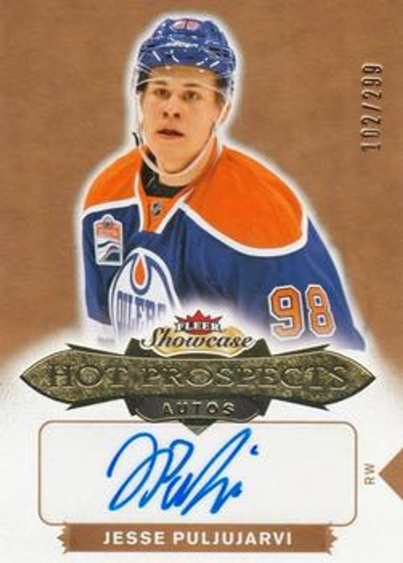 The Jesse Puljujarvi 2016 Fleer Showcase #183 Base /399 Rookie card is 1 of 22 Jesse Puljujarvi's card variations in the 2016 Fleer Showcase set being tracked by Sports Card Investor, including Hot Prospects Autographs Patch /135, Red Glow /25, Hot Prospects Autographs Patch White Hot /10, White Hot /5, and EX 2017.