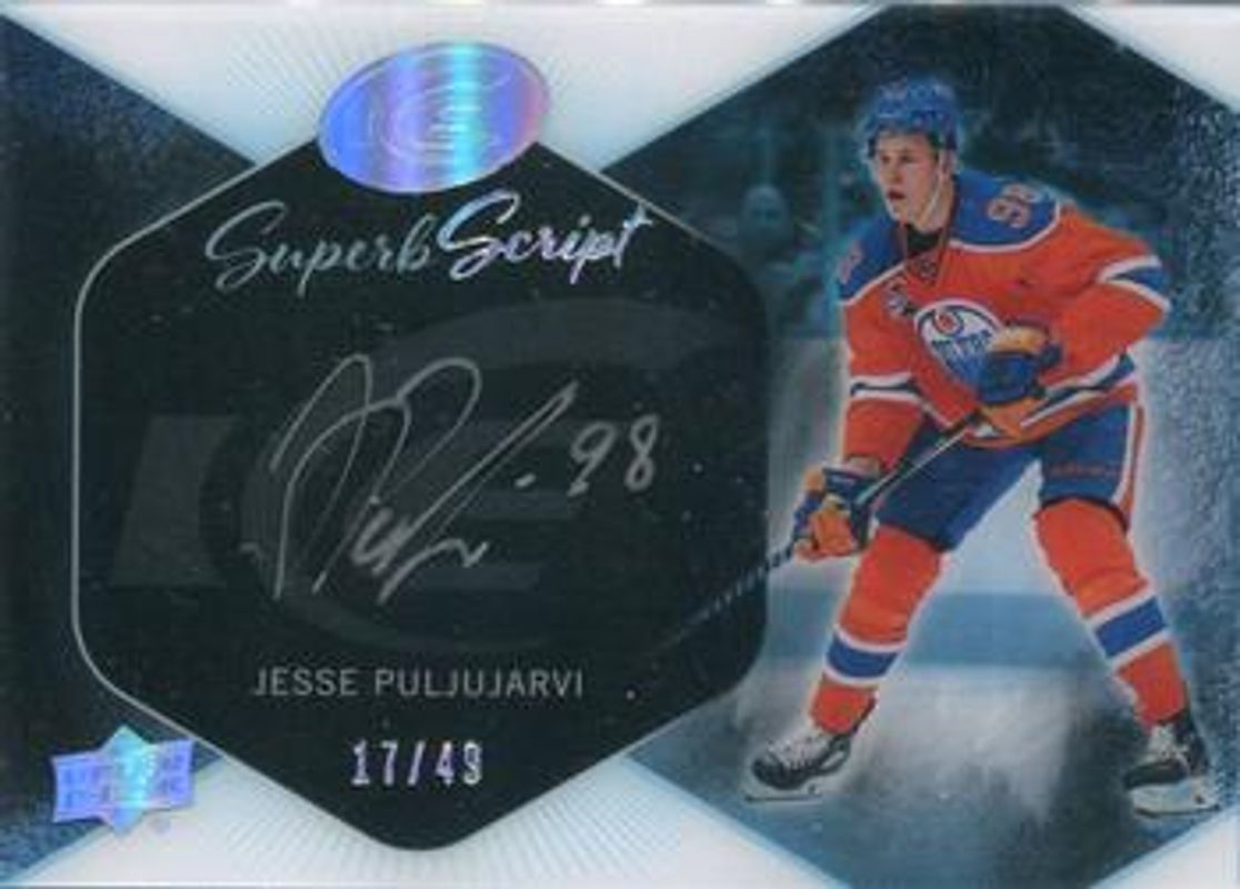 The Jesse Puljujarvi 2016 Upper Deck Ice #SS-JP Superb Script /25 Rookie card is 1 of 18 Jesse Puljujarvi's card variations in the 2016 Upper Deck Ice set being tracked by Sports Card Investor, including Base /1299, Ice Premieres die-cut /999, Fresh Threads, Rinkside Signings, and SubZero.