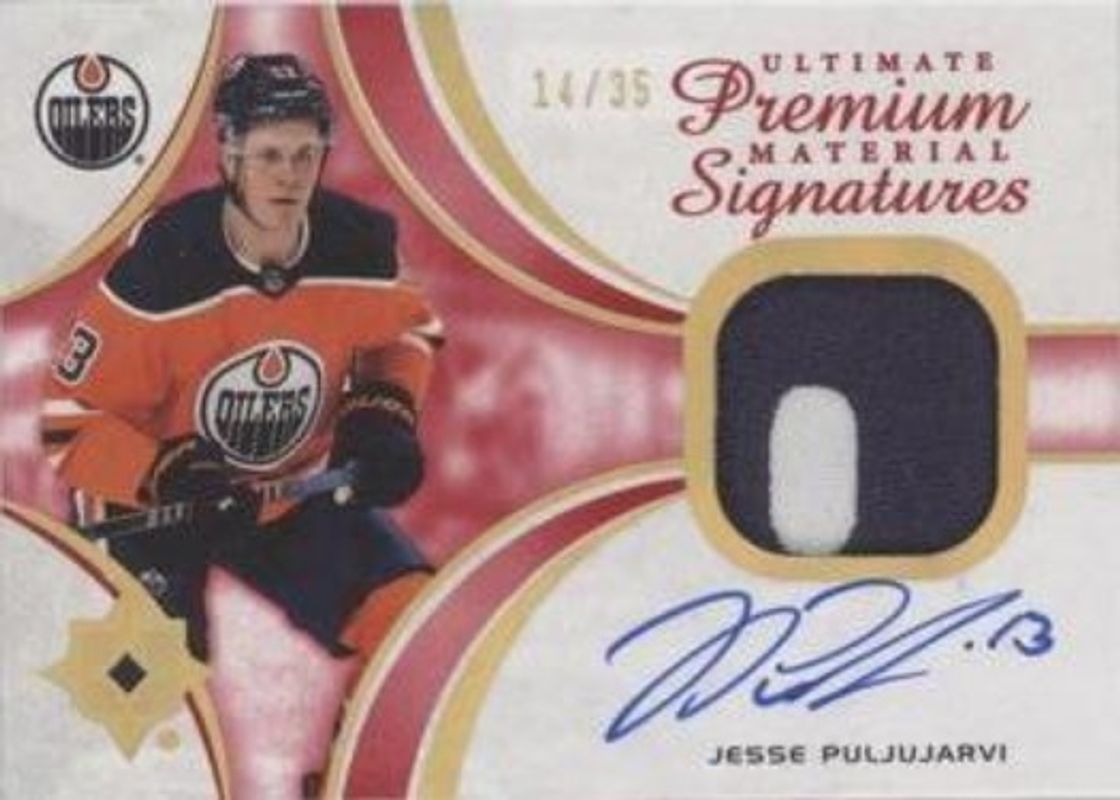 The Jesse Puljujarvi 2021 Upper Deck Ultimate Collection #UMS-PU Ultimate Premium Material Signatures /15 card is 1 of 21 Jesse Puljujarvi's card variations in the 2021 Upper Deck Ultimate Collection set being tracked by Sports Card Investor, including Base /299, Gold /35, Purple /15, Black /5, and Autographs.