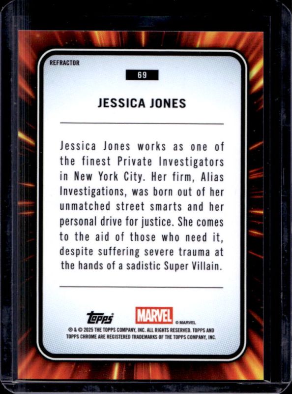 The Jessica Jones 2025 Topps Chrome #69 Refractor card is 1 of 23 Jessica Jones' card variations in the 2025 Topps Chrome set being tracked by Sports Card Investor, including Base, Yellow Lava Refractor, Spider Web Refractor /399, Blue Refractor /299, and Blue & Green Shimmer Refractor /199.