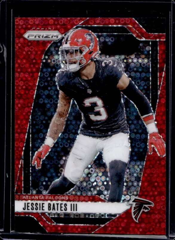 The Jessie Bates III 2024 Prizm #14 No Huddle Red /75 card is 1 of 83 Jessie Bates III's card variations in the 2024 Prizm set being tracked by Sports Card Investor, including Base, Choice Blue Yellow Green, Choice Silver, Disco, and Green.