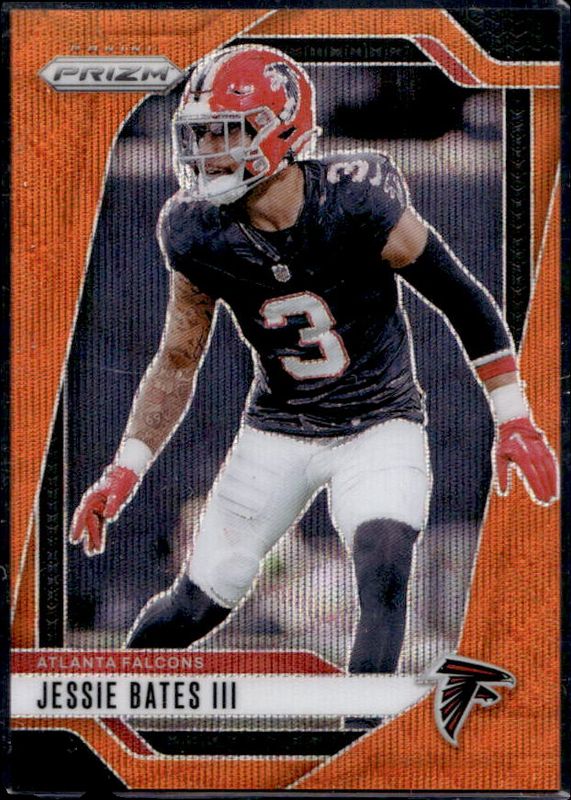 The Jessie Bates III 2024 Prizm #14 Orange Wave /60 card is 1 of 83 Jessie Bates III's card variations in the 2024 Prizm set being tracked by Sports Card Investor, including Base, Choice Blue Yellow Green, Choice Silver, Disco, and Green.