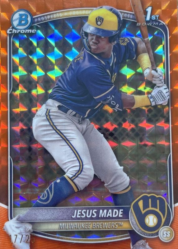 The Jesus Made 2025 Bowman #BCP-50 Chrome Prospects - Orange Geometric Refractor /25 (1st) card in Raw condition has not changed in price in the last 30 days and was last sold for $500.00 .