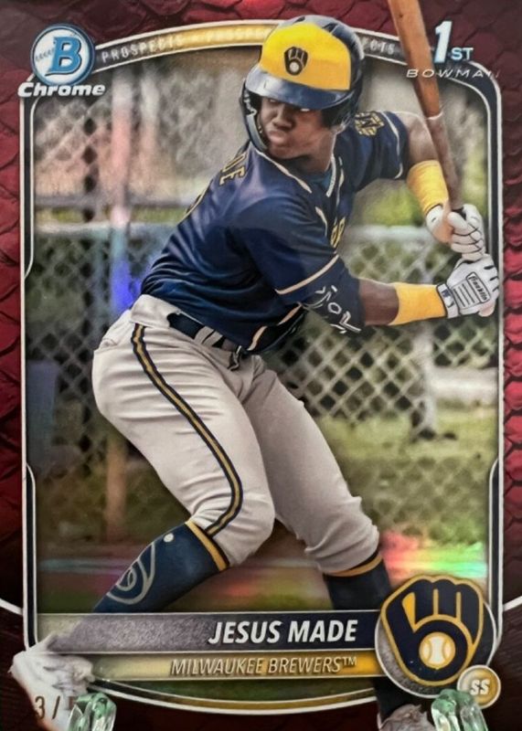 The Jesus Made 2025 Bowman #BCP-50 Chrome Prospects - Reptilian Red Refractor /5 (1st) card in Raw condition has not changed in price in the last 30 days and was last sold for $686.00 .