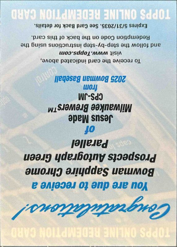 The Jesus Made 2025 Bowman Sapphire Edition #CPS-JM Chrome Prospect Autographs - Green Refractor /99 card is 1 of 16 Jesus Made's card variations in the 2025 Bowman Sapphire Edition set being tracked by Sports Card Investor, including Chrome Prospects, Chrome Prospect Autographs /199, Chrome Prospects - Green Refractor /99, Chrome Prospects - Yellow Refractor /75, and Chrome Prospect Autographs - Gold Refractor /50.