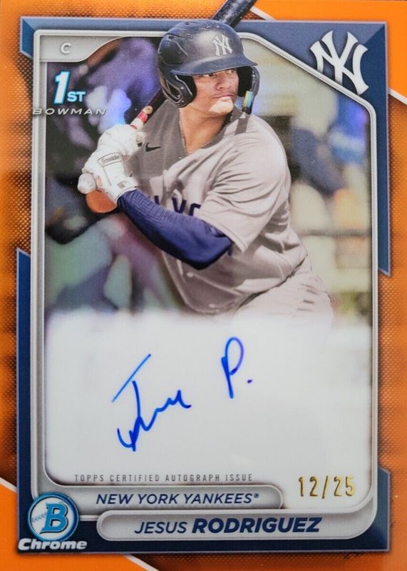 The Jesus Rodriguez 2024 Bowman #CPA-JR Chrome Prospect Auto - Orange Refractor /25 (1st) card in Raw condition has not changed in price in the last 30 days and was last sold for $146.00 .