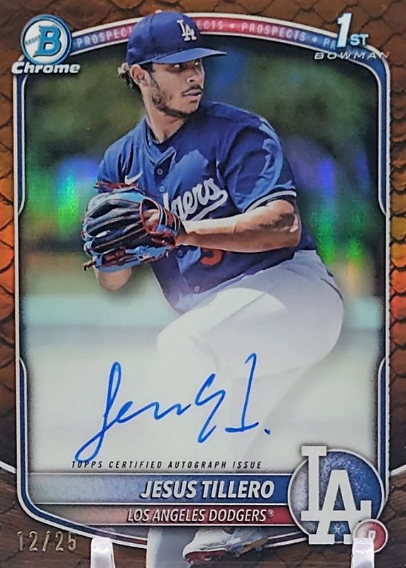 The Jesus Tillero 2025 Bowman #CPA-JT Chrome Prospect Auto - Reptilian Orange Refractor /25 (1st) card in Raw condition has not changed in price in the last 30 days and was last sold for $26.99 .