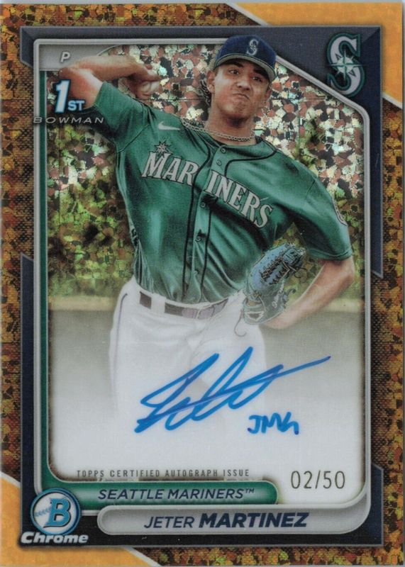 This card is 1 of 25 Jeter Martinez's card variations in the 2024 Bowman Chrome set being tracked by Sports Card Investor, including Prospect Auto (1st), Prospect Auto - Refractor /499 (1st), Prospect Auto - Speckle Refractor /299 (1st), Prospect Auto - Purple Refractor /250 (1st), and Prospect Auto - Blue RayWave Refractor /150 (1st).
