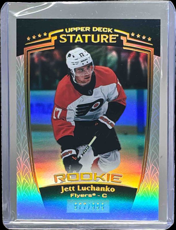 The Jett Luchanko 2024 Upper Deck Stature #35 Base Rookie card is 1 of 22 Jett Luchanko's card variations in the 2024 Upper Deck Stature set being tracked by Sports Card Investor, including Green /375, Red /249, Orange /199, Blue /99, and Gold /50.