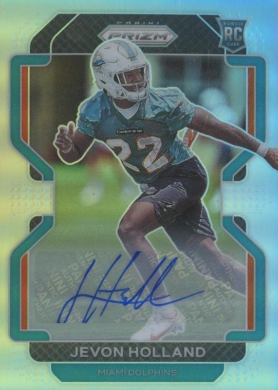This card is 1 of 18 Jevon Holland's card variations in the 2021 Prizm set being tracked by Sports Card Investor, including Silver, Rookie Autographs - No Huddle, Rookie Autographs - Pink, Rookie Autographs - Purple Pulsar, and Rookie Autographs - Red Wave /149.