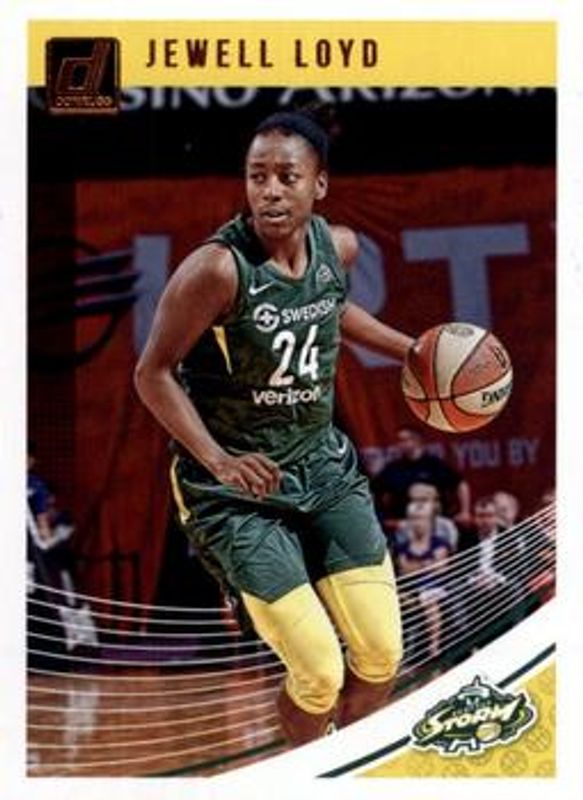 The Jewell Loyd 2019 Donruss WNBA #82 Base card is 1 of 24 Jewell Loyd's card variations in the 2019 Donruss WNBA set being tracked by Sports Card Investor, including Optic, Optic Holo, Silver Press Proof /199, Purple Press Proof /99, and Gold Laser Press Proof /10.