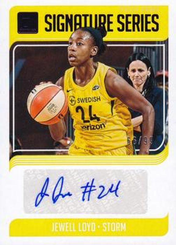 The Jewell Loyd 2019 Donruss WNBA #SS-JLD Signatures Series - Press Proof Purple /99 card is 1 of 24 Jewell Loyd's card variations in the 2019 Donruss WNBA set being tracked by Sports Card Investor, including Base, Optic, Optic Holo, Silver Press Proof /199, and Purple Press Proof /99.