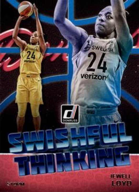 The Jewell Loyd 2019 Donruss WNBA #4 Swishful Thinking card is 1 of 24 Jewell Loyd's card variations in the 2019 Donruss WNBA set being tracked by Sports Card Investor, including Base, Optic, Optic Holo, Silver Press Proof /199, and Purple Press Proof /99.