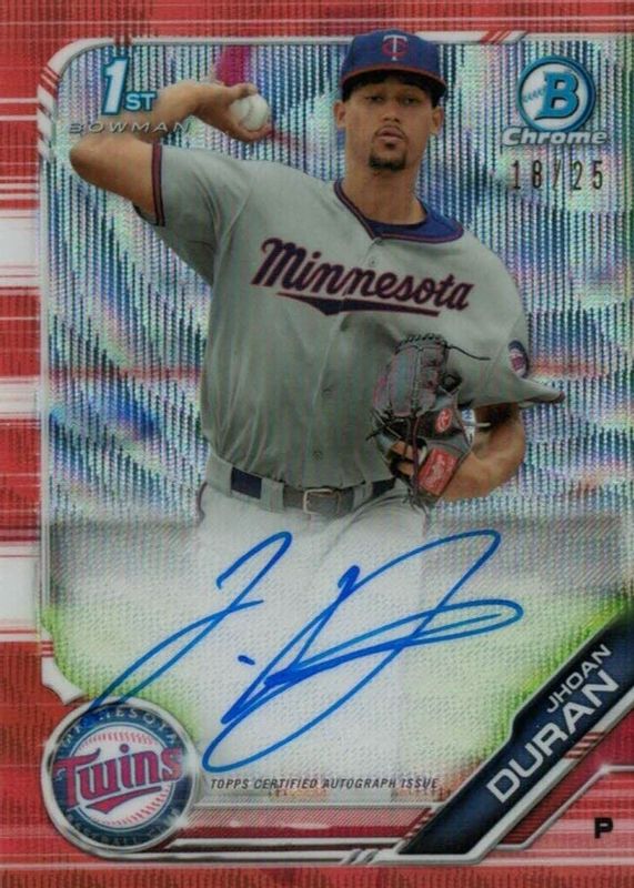 The Jhoan Duran 2019 Bowman Chrome #CPA-JDU Prospect Auto - Orange Wave Refractor /25 (1st) card in Raw condition has not changed in price in the last 30 days and was last sold for $47.00 .
