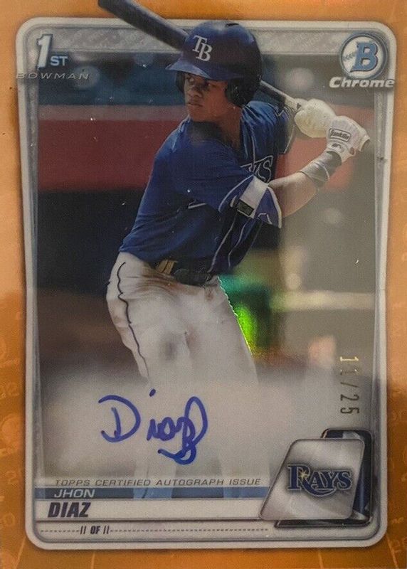 Jhon Diaz's Baseball cards are available in at least 3 sets. Jhon Diaz's biggest 7-day price movers are 2020 Bowman #CPA-JDI Chrome Prospect Auto - Orange Refractor /25 (1st), 2020 Bowman #CPA-JDI Chrome Prospect Auto - Yellow Refractor /75 (1st), and 2020 Bowman #BP-30 Paper Prospects - Camo (1st).