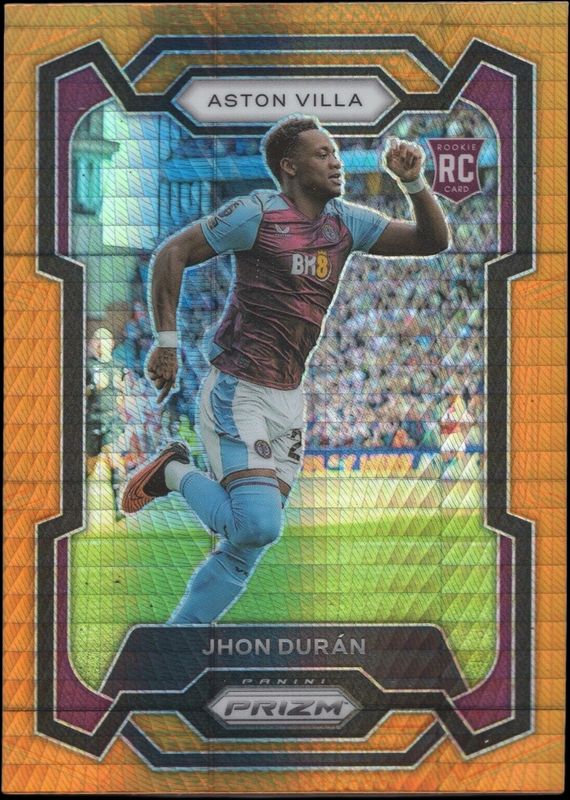 The Jhon Duran 2023 Prizm Premier League #109 Orange Hyper Rookie card is 1 of 70 Jhon Duran's card variations in the 2023 Prizm Premier League set being tracked by Sports Card Investor, including Base, Blue Mosaic, Breakaway, Breakaway Orange, and Choice.