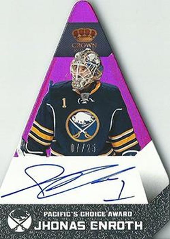 The Jhonas Enroth 2013 Crown Royale #PC-JEN Pacific's Choice Autographs Ruby Holofoil /25 card is 1 of 2 Jhonas Enroth's card variations in the 2013 Crown Royale set being tracked by Sports Card Investor, including Pacific's Choice Autographs Ruby /99.