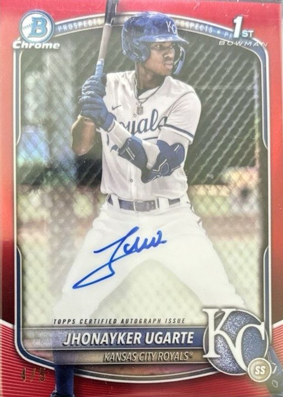 The Jhonayker Ugarte 2025 Bowman #CPA-JU Chrome Prospect Auto - Red Refractor /5 (1st) card in Raw condition has not changed in price in the last 30 days and was last sold for $1,500.00 .
